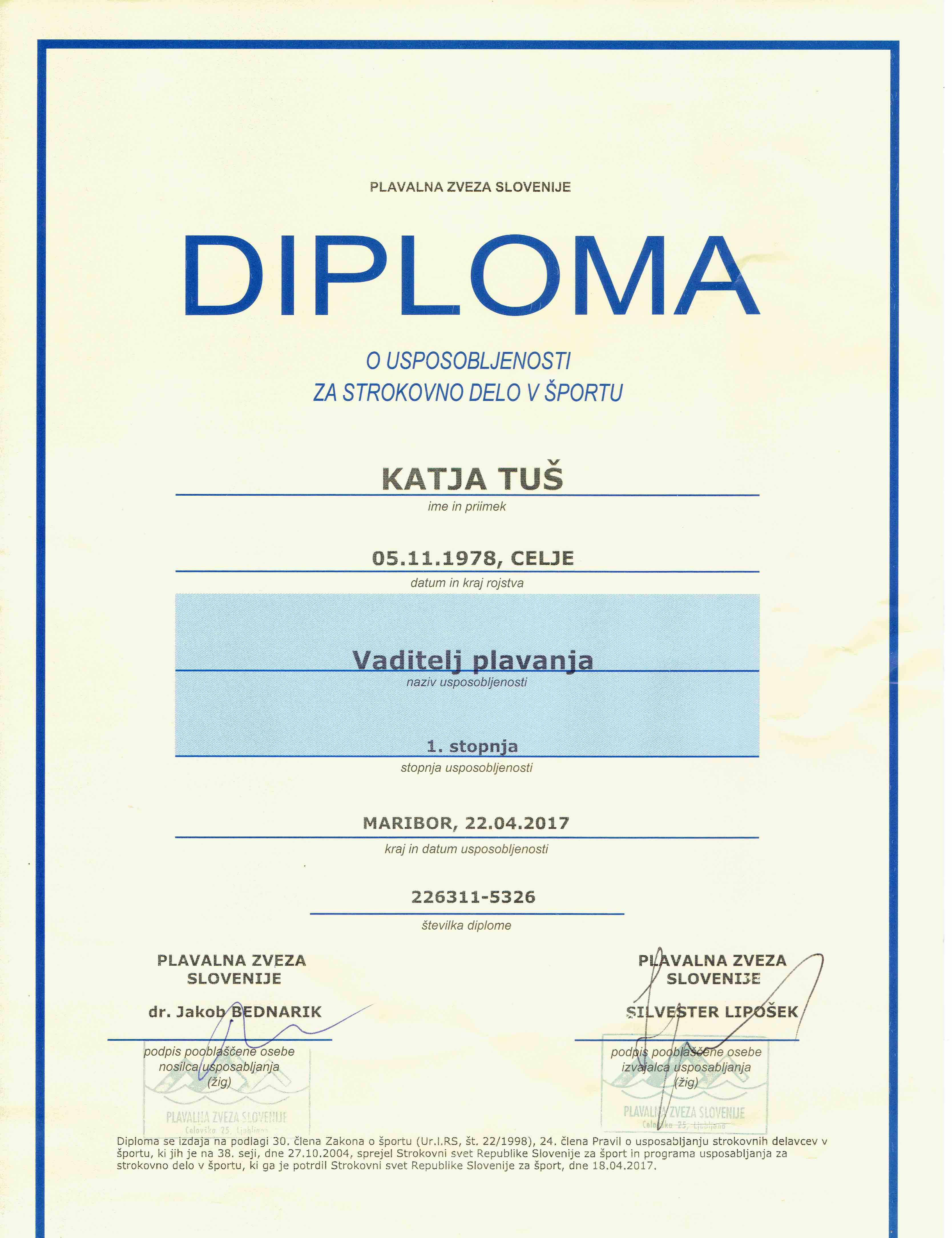 Sem certificirana učiteljica hatha joge (RYS 200 Yoga Alliance, RJU 300), vaditeljica plavanja, vaditeljica športne rekreacije in učiteljica deskanja na snegu 1.