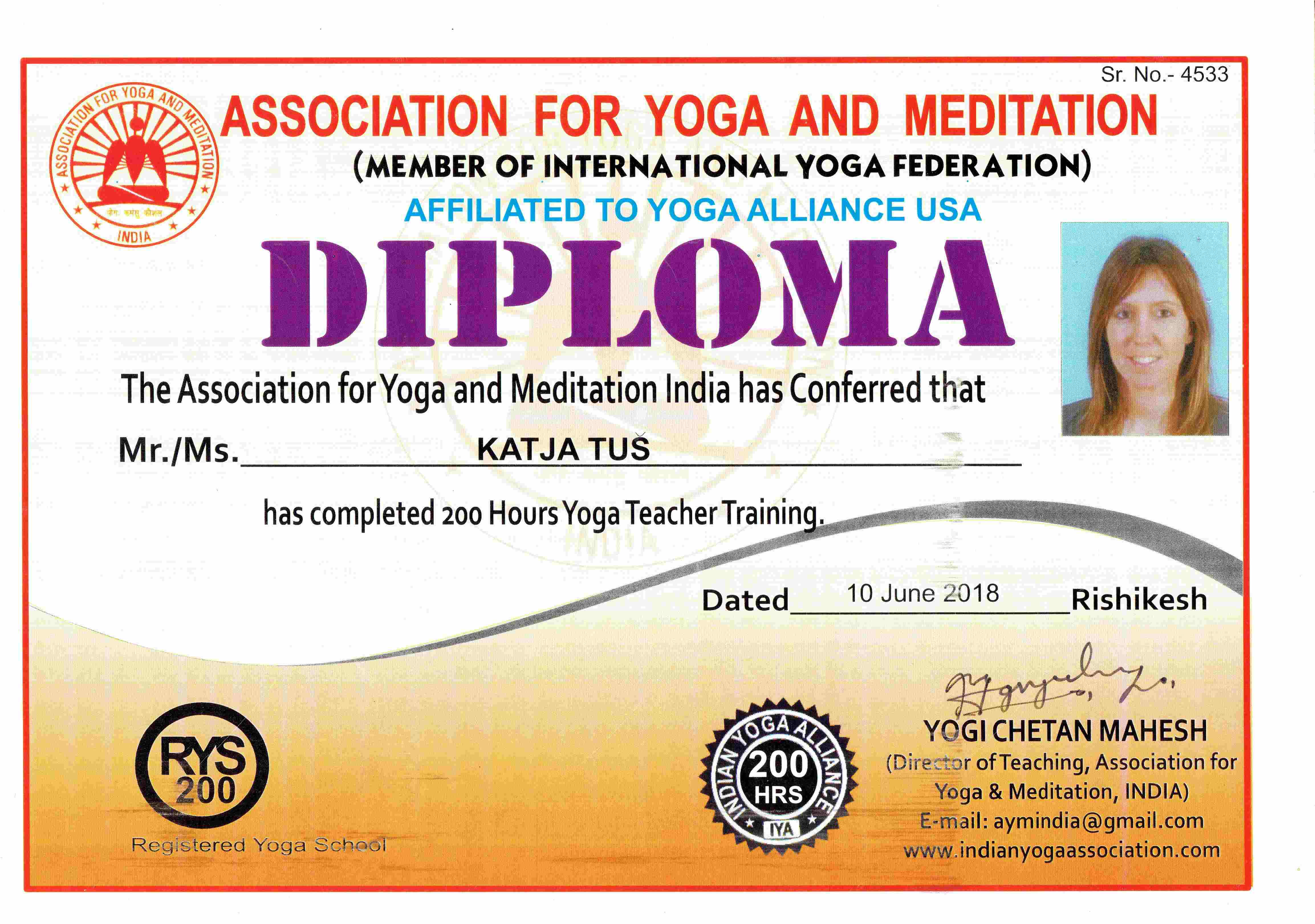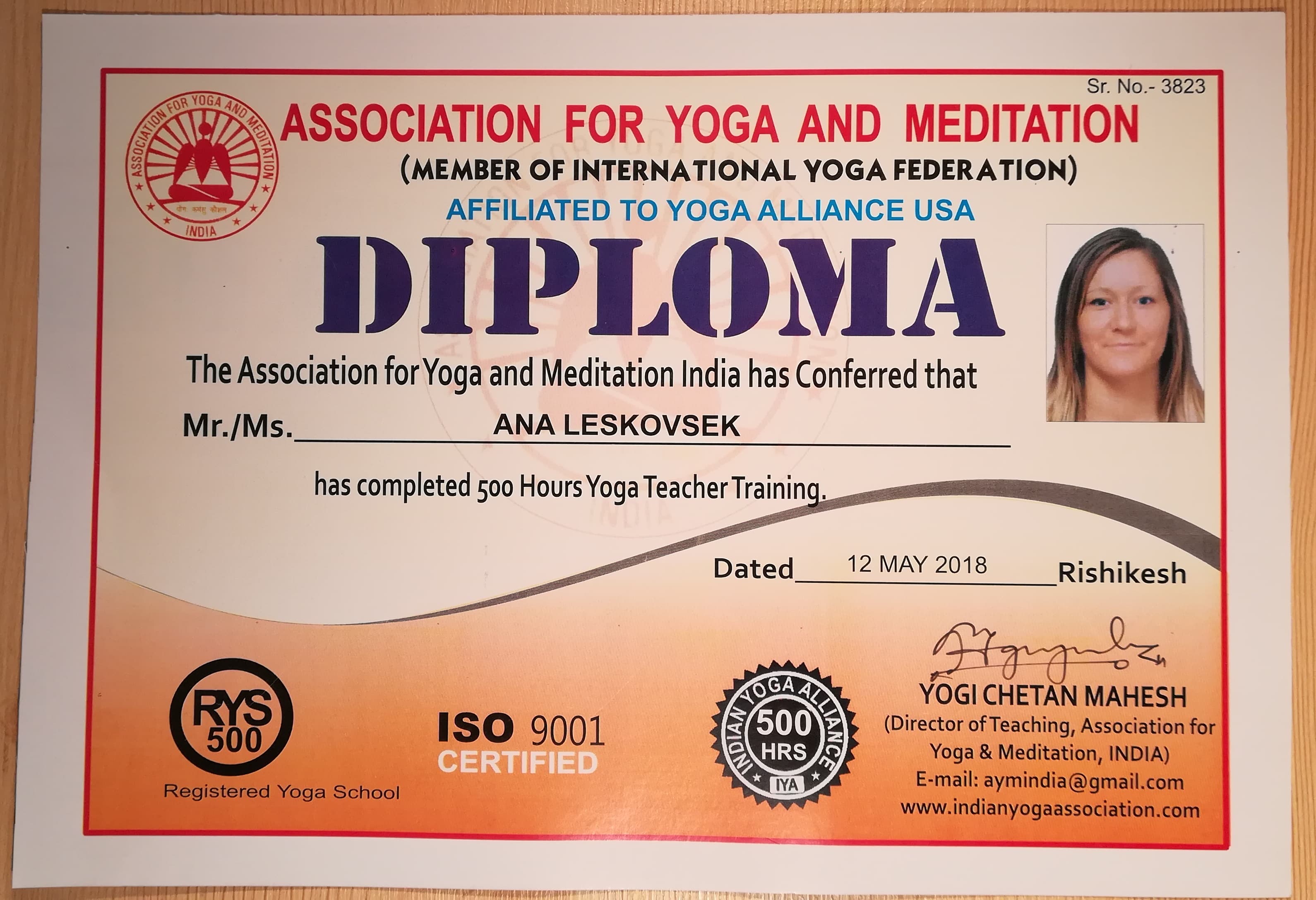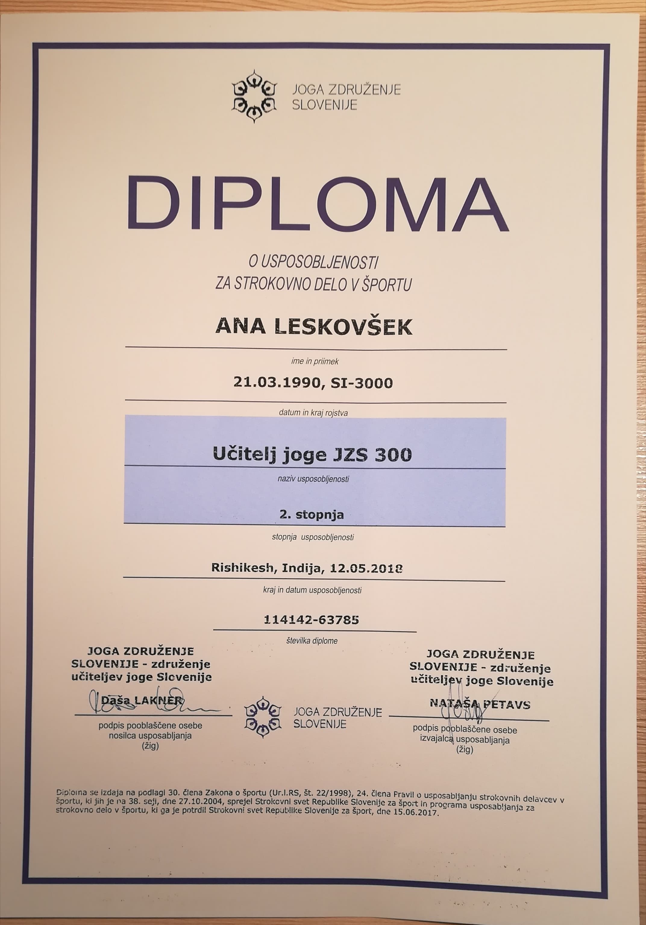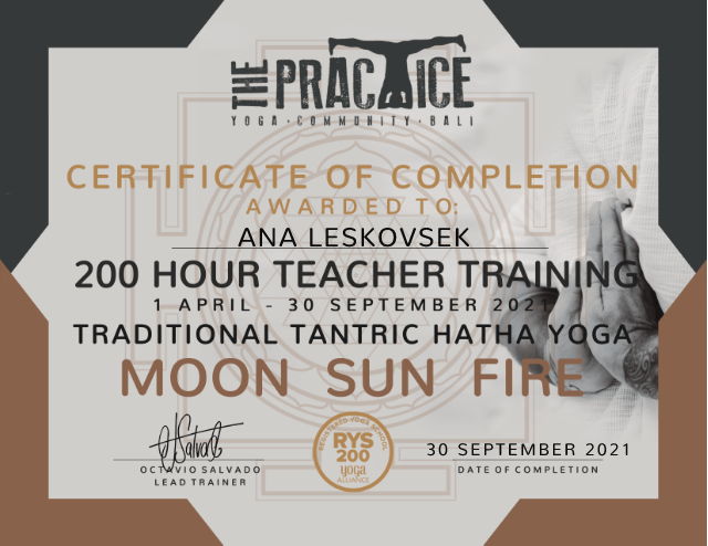 Ana je certificirana učiteljica hatha joge (RYS 500 Yoga Alliance), in učiteljica tradicionalne hatha tantra joge (RYU 200 Traditional hatha tantra yoga).